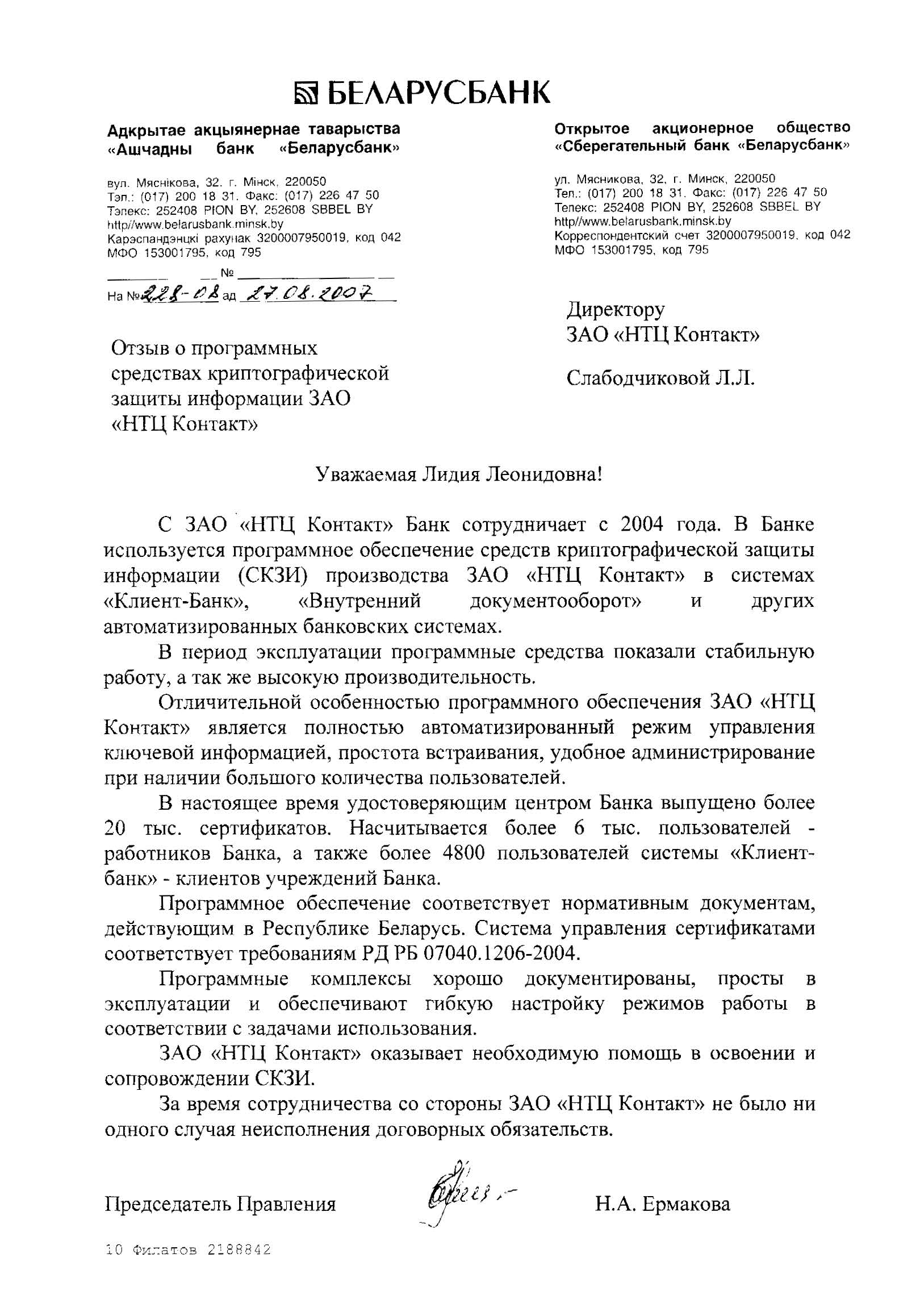 Унитарное предприятие по оказанию услуг «Удостоверяющий центр «БУТБ» положительно оценивает сотрудничество с ЗАО «НТЦ КОНТАКТ», которое позволяет предприятию постоянно соответствовать действующим требованиям по информационной безопасности.