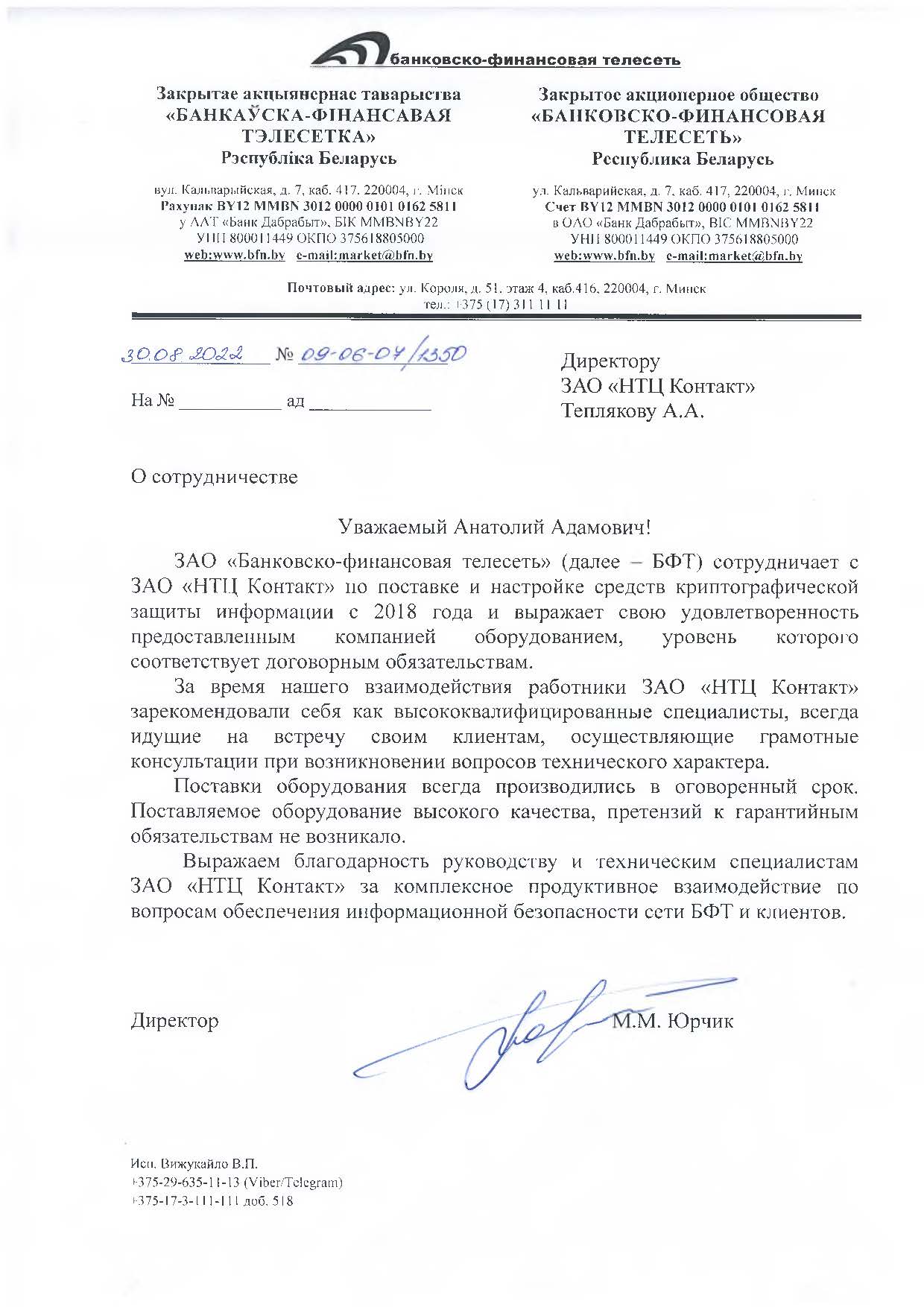 ЗАО «Банковско-финансовая телесеть» (далее - БФТ) сотрудничает с ЗАО «НТЦ КОНТАКТ» по поставке и настройке средств криптографической защиты информации с 2018 года и выражает свою удовлетворенность предоставленным компанией оборудованием, уровень которого соответствует договорным обязательствам.