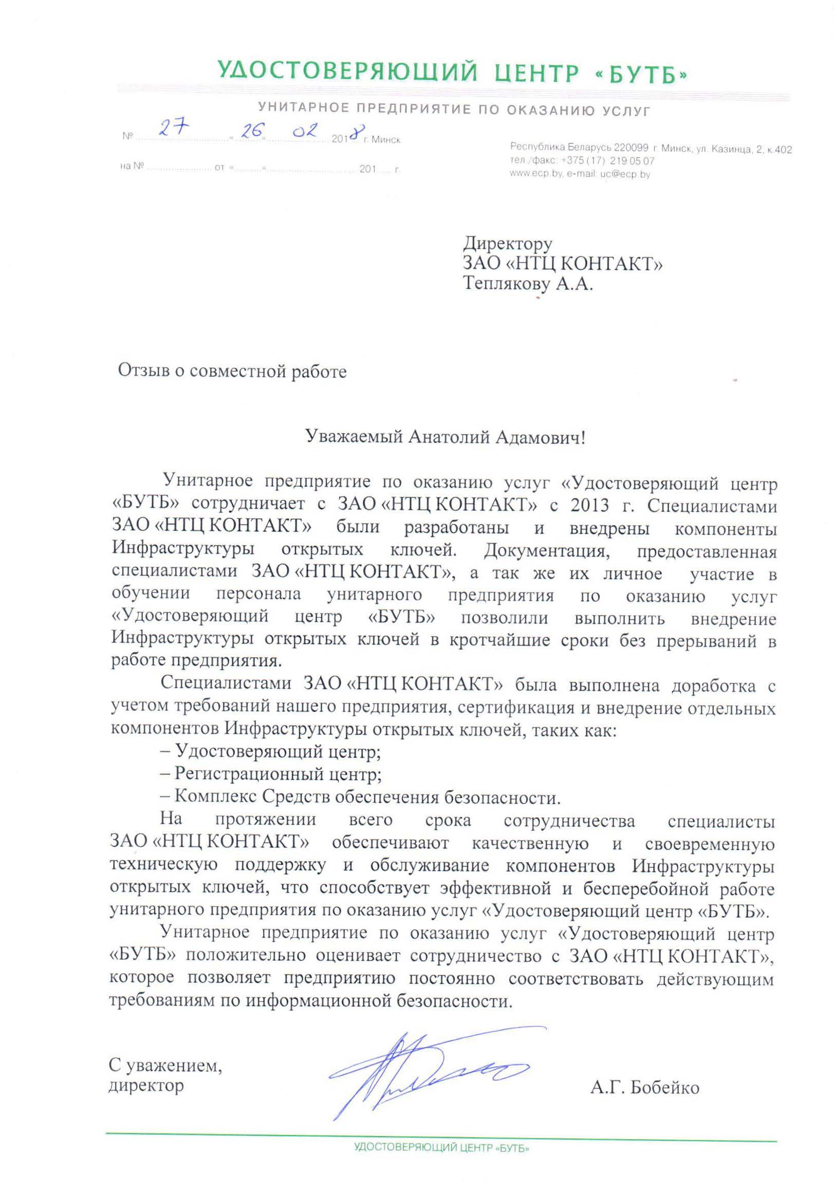 Унитарное предприятие по оказанию услуг «Удостоверяющий центр «БУТБ» сотрудничает с ЗАО «НТЦ КОНТАКТ» с 2013 г. Специалистами ЗАО «НТЦ КОНТАКТ» были разработаны и внедрены компоненты Инфраструктуры открытых ключей. Документация, предоставленная специалистами ЗАО «НТЦ КОНТАКТ», а так же их личное участие в обучении персонала унитарного предприятия по оказанию услуг «Удостоверяющий центр «БУТБ» позволили выполнить внедрение Инфраструктуры открытых ключей в кротчайшие сроки без прерываний в работе предприятия.