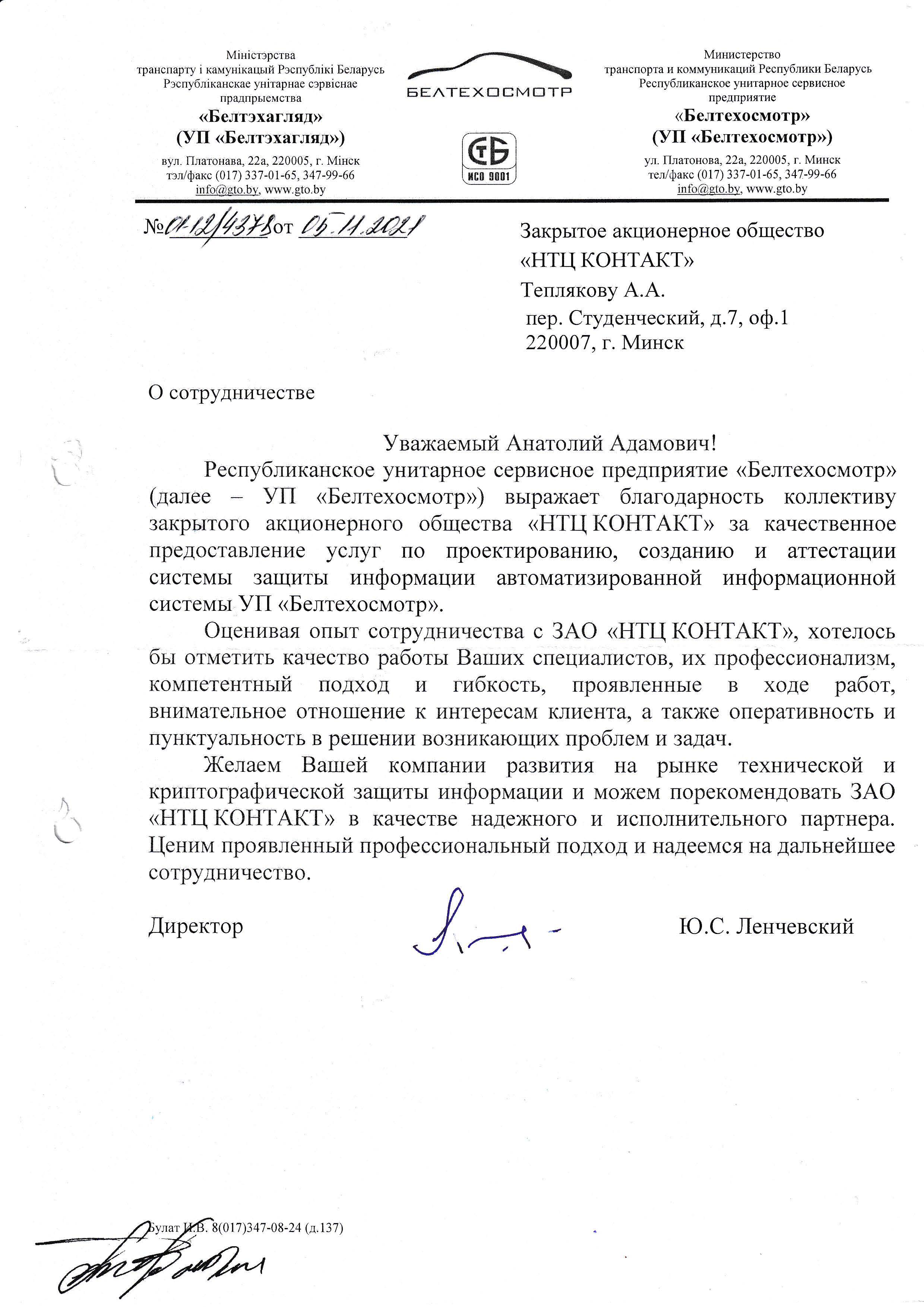 Республиканское унитарное сервисное предприятие «Белтехосмотр» (далее - УП «Белтехосмотр») выражает благодарность коллективу ЗАО «НТЦ КОНТАКТ» за качественное предоставление услуг по проектированию, созданию и аттестации системы защиты информации автоматизированной информационной системы УП «Белтехосмотр».