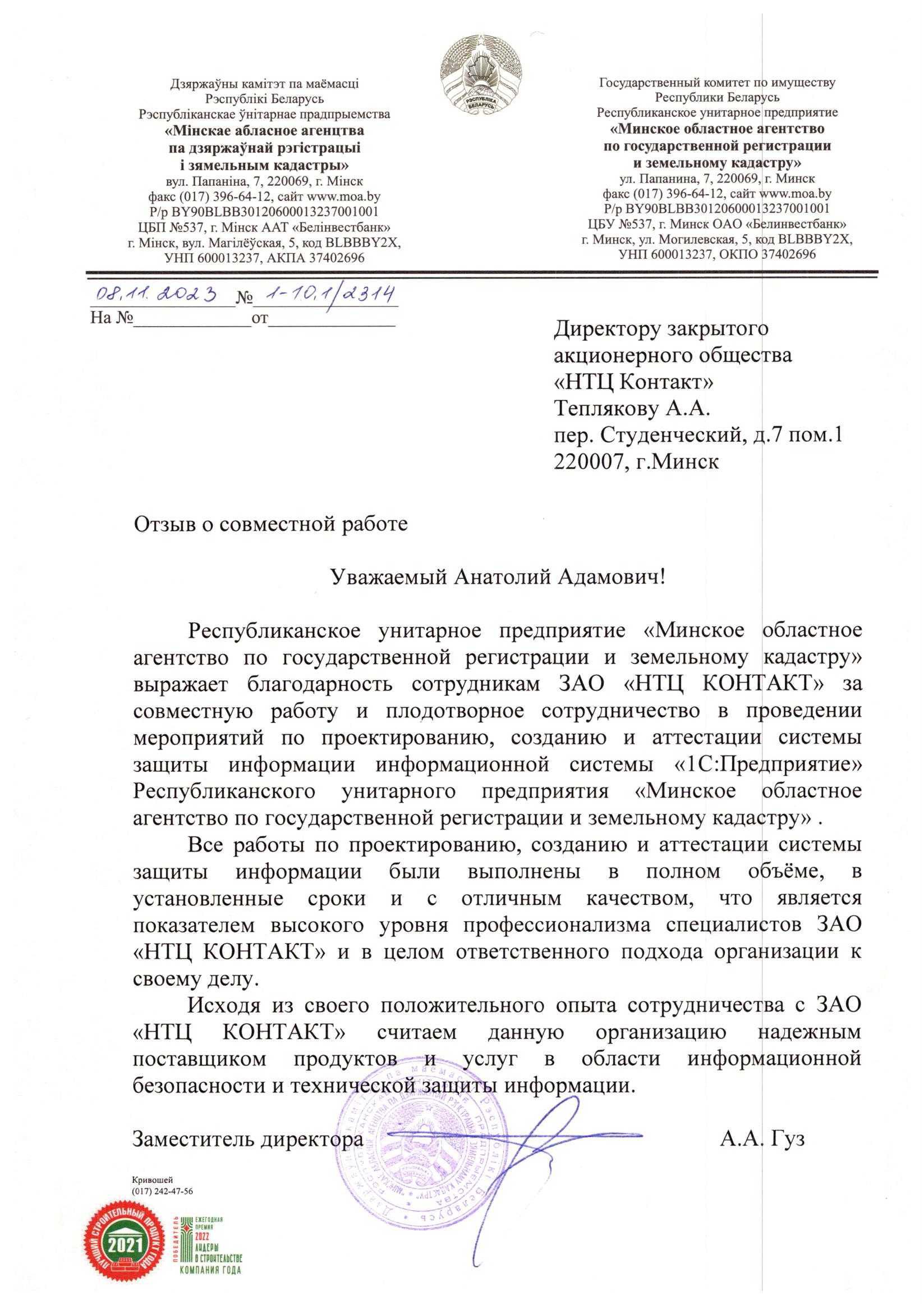 Республиканское унитарное предприятие «Минское областное агентство по государственной регистрации и земельному кадастру» выражает благодарность сотрудникам ЗАО «НТЦ КОНТАКТ» за совместную работу и плодотворное сотрудничество в проведении мероприятий по проектированию, созданию и аттестации системы защиты информации информационной системы «1С:Предприятие» Республиканского унитарного предприятия «Минское областное агентство по государственной регистрации и земельному кадастру».