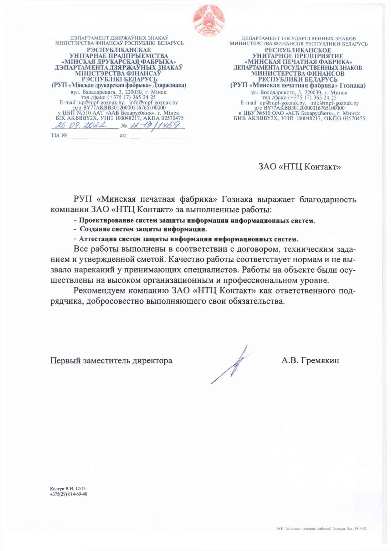 РУП «Минская печатная фабрика» Гознака выражает благодарность компании ЗАО «НТЦ КОНТАКТ» за выполненные работы: