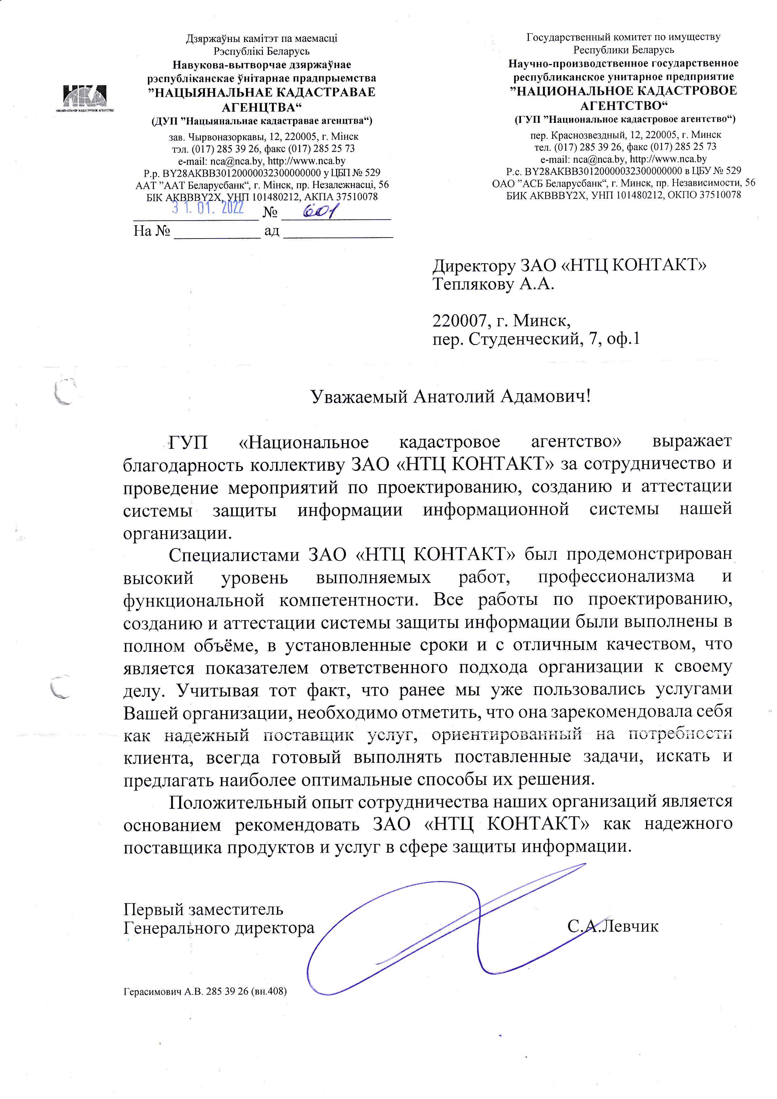 ГУП «Национальное кадастровое агентство» выражает благодарность коллективу ЗАО «НТЦ КОНТАКТ» за сотрудничество и проведение мероприятий по проектированию, созданию и аттестации системы защиты информации информационной системы нашей организации.