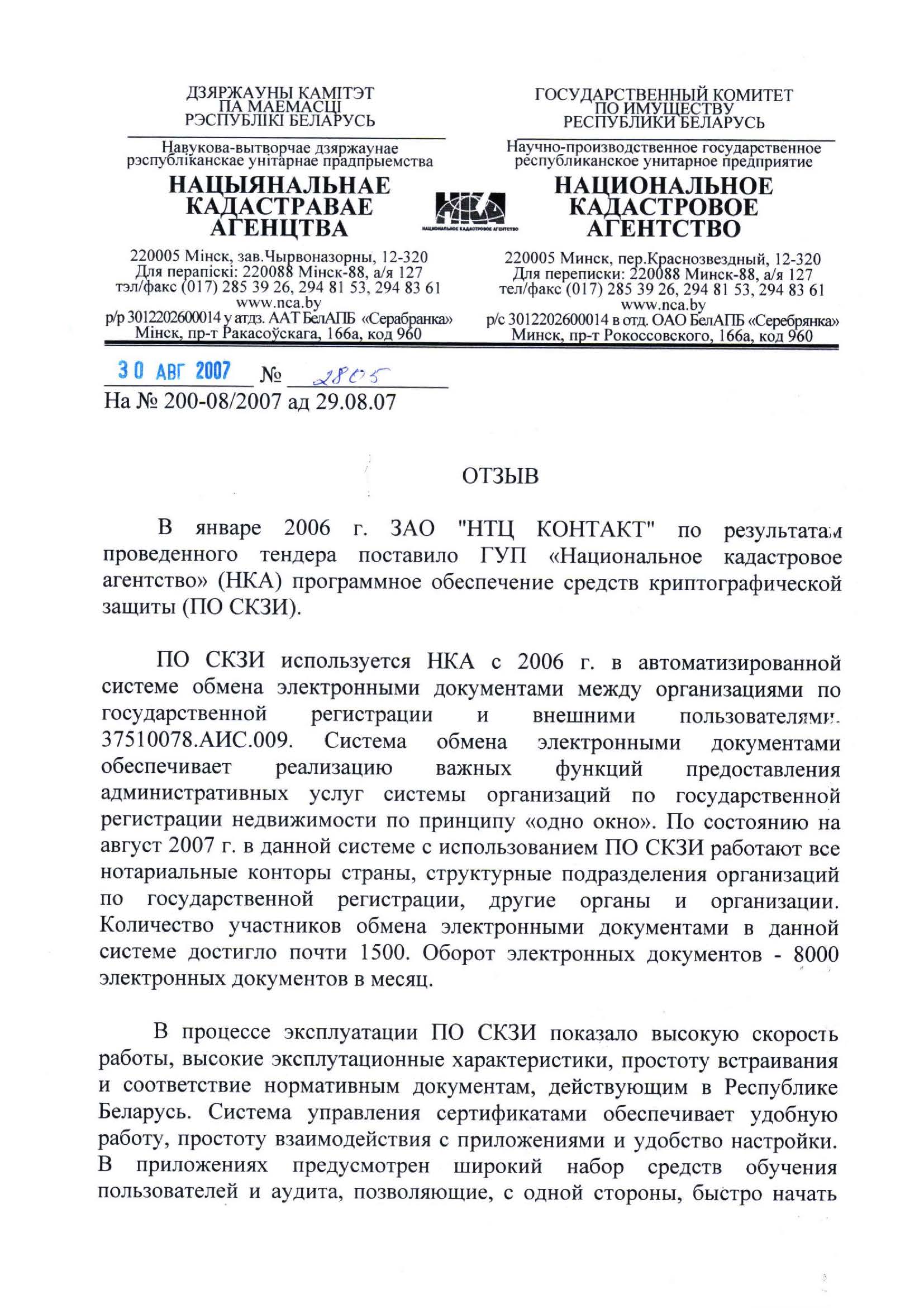 Программное обеспечение средств криптографической защиты информации (ПО СКЗИ) ЗАО «НТЦ КОНТАКТ» используется Национальным кадастровым агентством (НКА) с 2006 г. в автоматизированной системе обмена электронными документами между организациями по государственной регистрации и внешними пользователями.