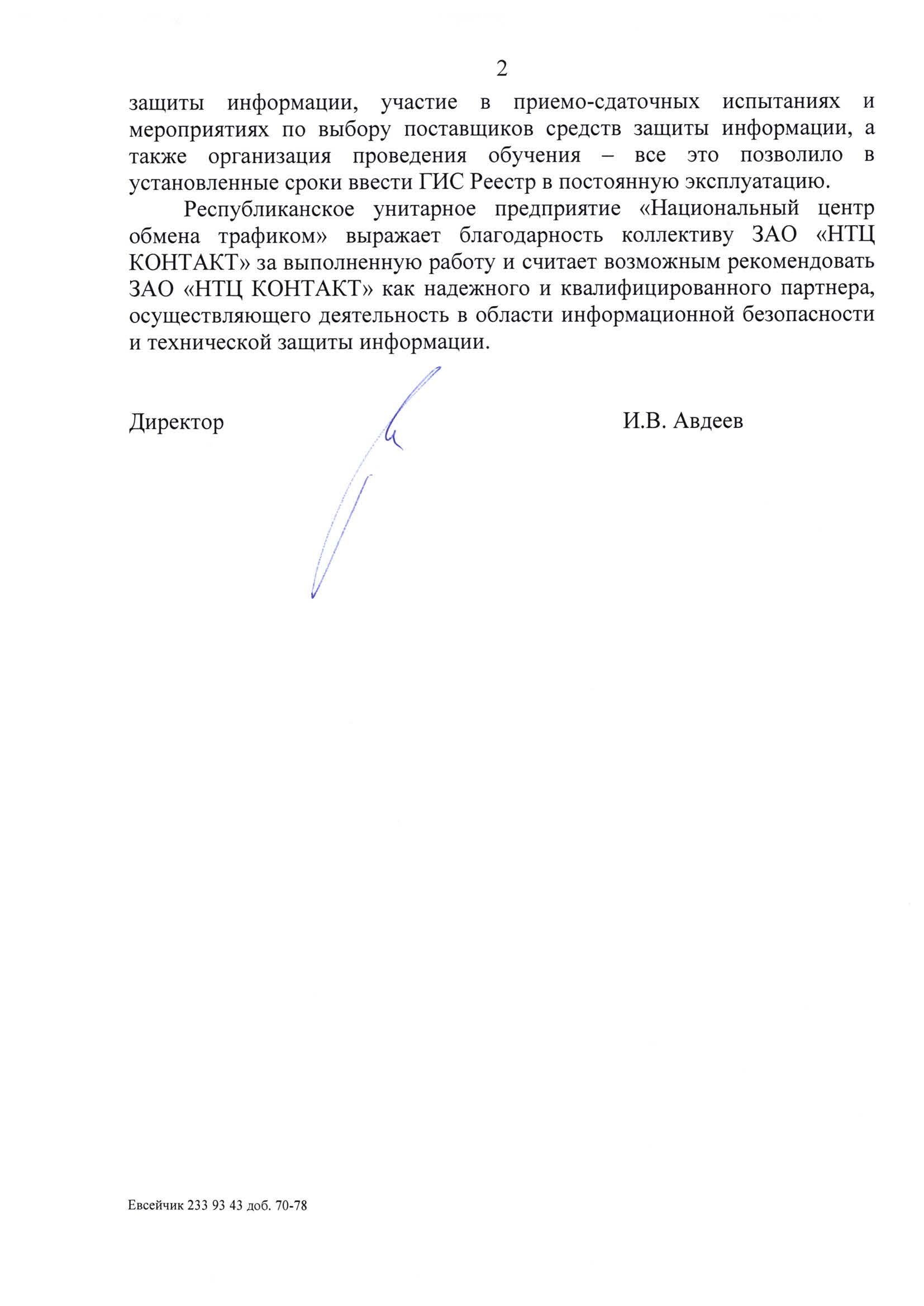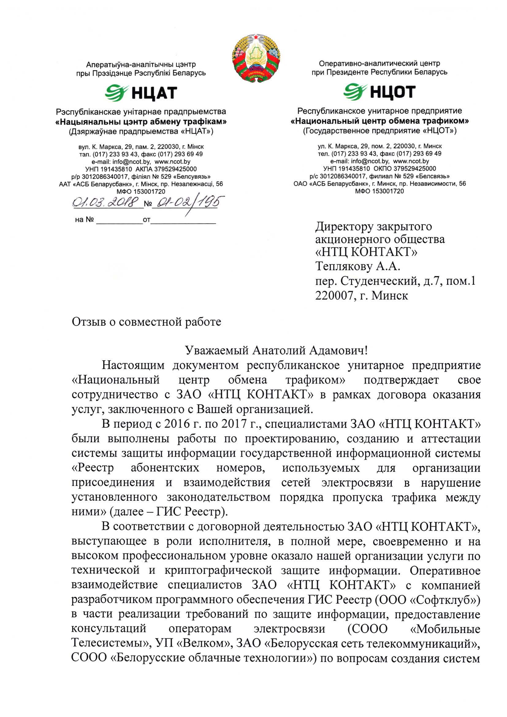 Республиканское унитарное предприятие «Национальный центр обмена трафиком» выражает благодарность коллективу ЗАО «НТЦ КОНТАКТ» за выполненную работу и считает возможным рекомендовать ЗАО «НТЦ КОНТАКТ» как надежного и квалифицированного партнера, осуществляющего деятельность в области информационной безопасности и технической защиты информации.