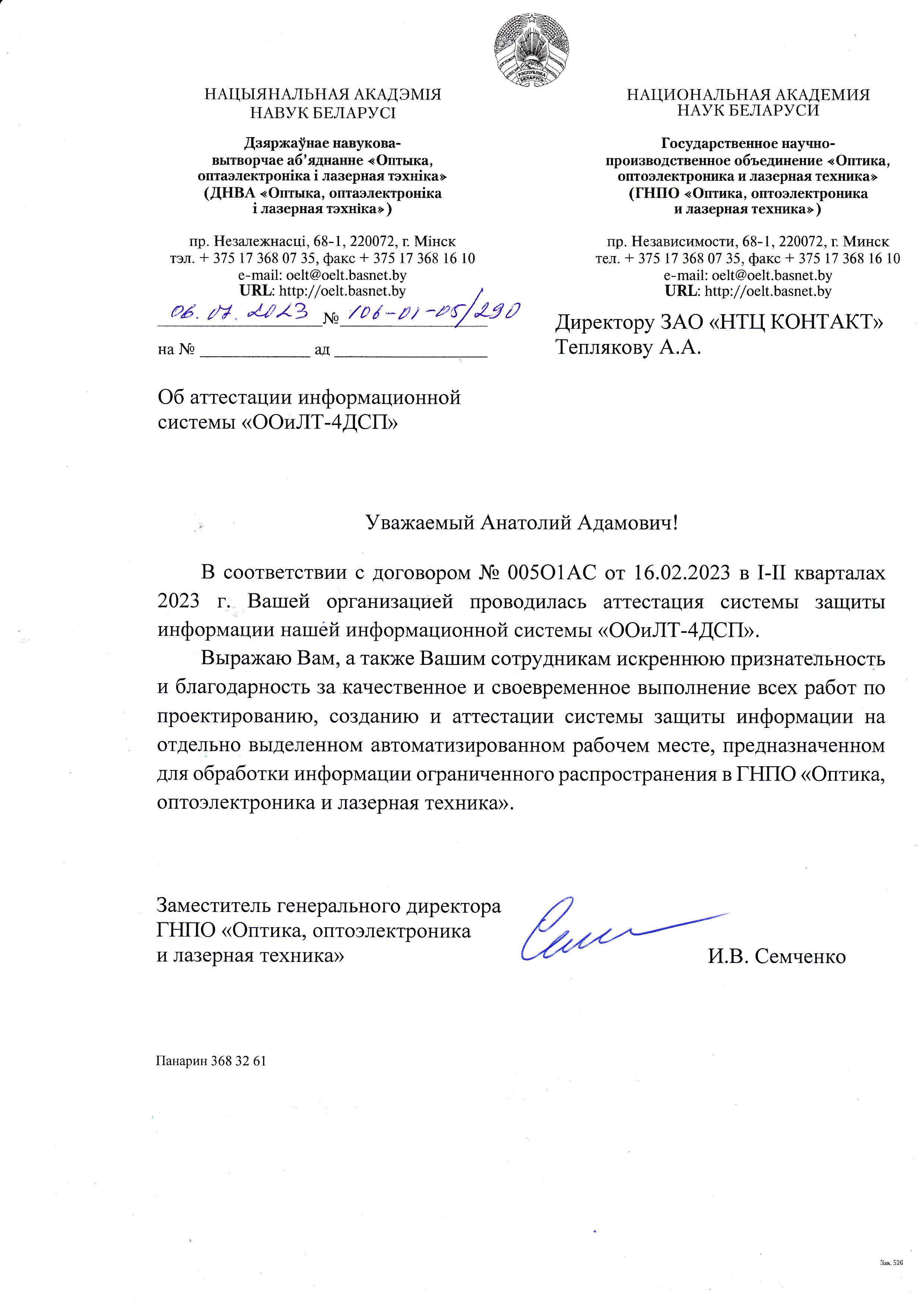 В соответствии с договорной деятельностью ЗАО «НТЦ КОНТАКТ», выступающее в роли исполнителя, в полной мере, своевременно и на высоком профессиональном уровне оказало нашей организации услугу по технической и криптографической защите информации. Оперативное взаимодействие специалистов ЗАО «НТЦ КОНТАКТ» с компанией разработчиком программного обеспечения ГИС Реестр (ООО «Софтклуб») в части реализации требований по защите информации, предоставление консультаций операторам электросвязи (СООО «Мобильные Телесистемы», УП «Велком», ЗАО «Белорусская сеть телекоммуникаций», СООО «Белорусские облачные технологии») по вопросам создания систем защиты информации, участие в приемо-сдаточных испытаниях и мероприятиях по выбору поставщиков средств защиты информации, а также организация проведения обучения – все это позволило в установленные сроки ввести ГИС Реестр в постоянную эксплуатацию.
