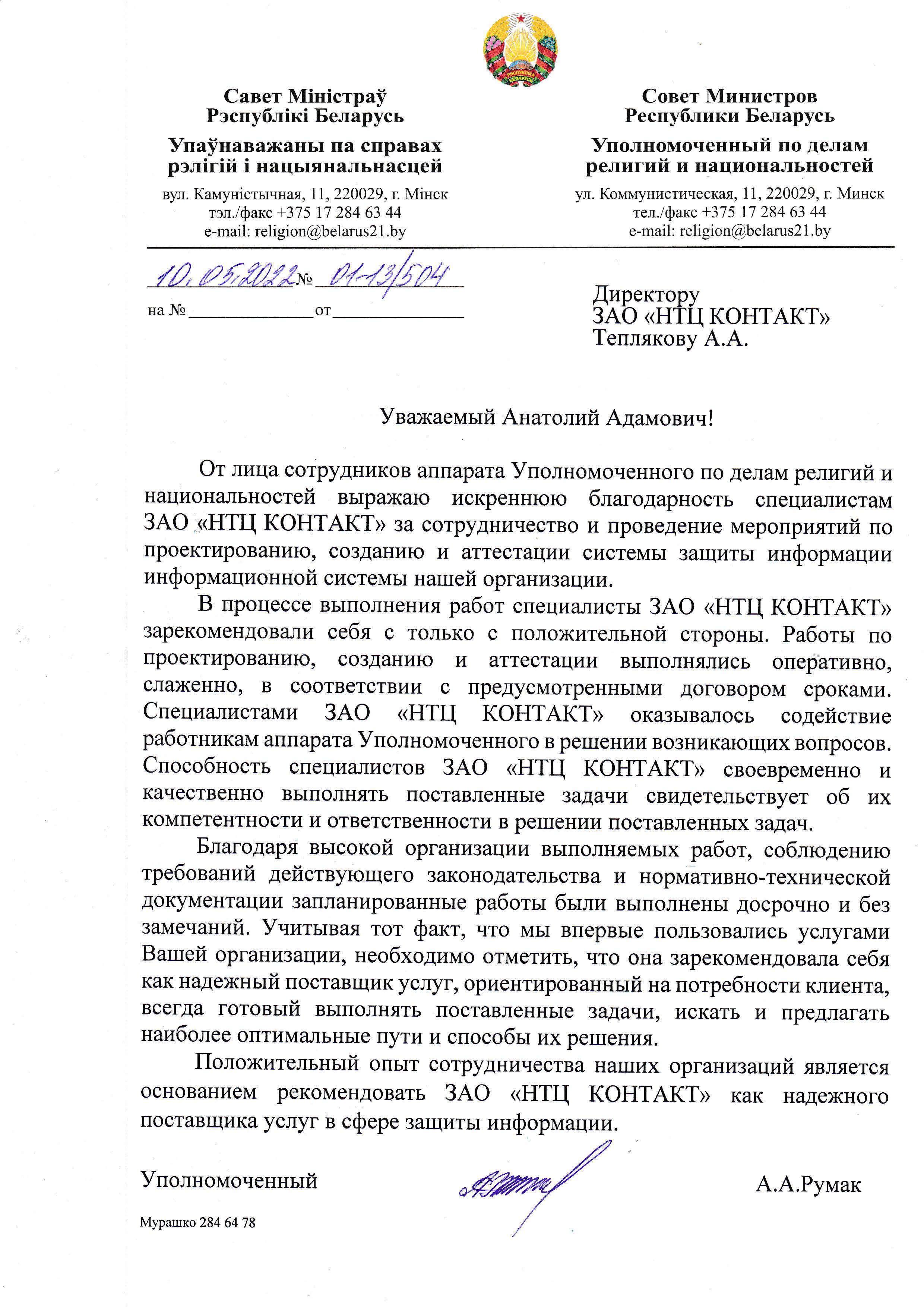 От лица сотрудников аппарата Уполномоченного по делам религий и национальностей выражаю искреннюю благодарность специалистам ЗАО «НТЦ КОНТАКТ» за сотрудничество и проведение мероприятий по проектированию, созданию и аттестации системы защиты информации информационной системы нашей организации.