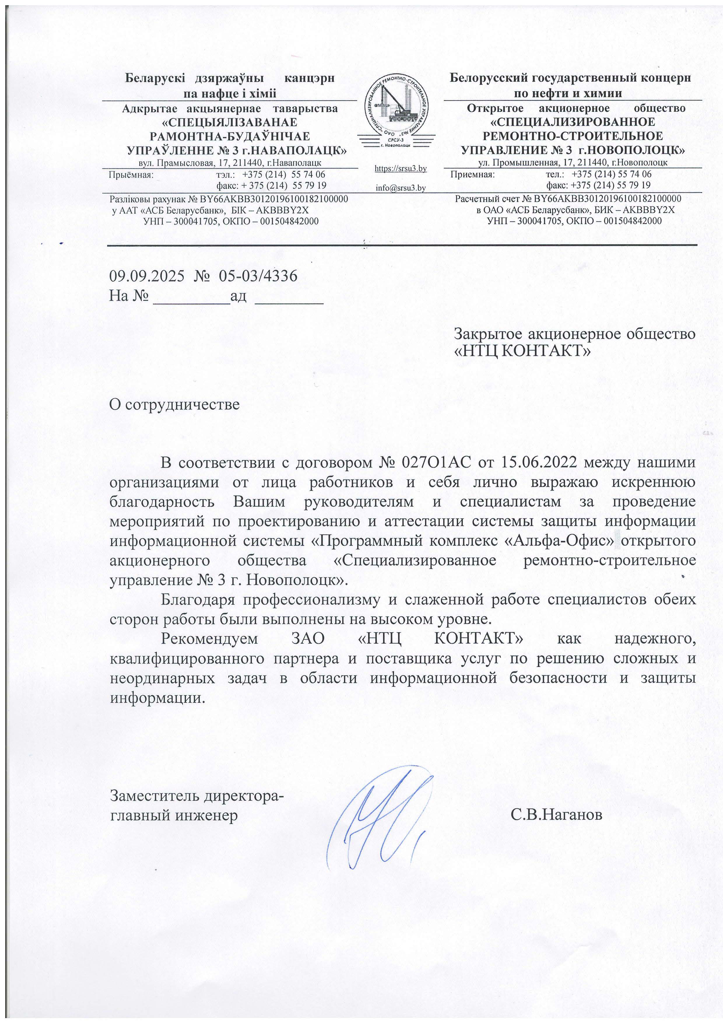 В соответствии с договором № 027O1AC от 15.06.2022 между нашими организациями от лица работников и себя лично выражаю искреннюю благодарности Вашим руководителям и специалистам за проведение мероприятия по проектированию и аттестации системы защиты информации информационной системы «Программный комплекс «Альфа-Офис» открытого акционерного общества «Специализированное ремонтно-строительное управление № 3 г. Новополоцк».