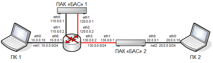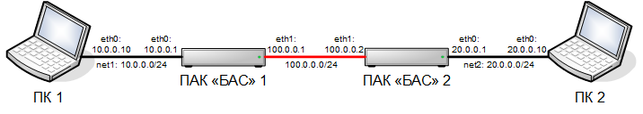 Данный сценарий описывает подключение к защищаемой при помощи ПАК «БАС» 1 подсети (ПК 1) другой защищаемой при помощи ПАК «БАС» 2 подсети (ПК 2), причем ПАК «БАС» 1 подключен по технологии Router-on-a-stick.