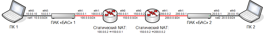 Данный сценарий описывает подключение к защищаемой при помощи ПАК «БАС» 1 подсети (ПК 1) другой защищаемой при помощи ПАК «БАС» 2 подсети (ПК 2), причем ПАК «БАС» 2 находится за статическим NAT.