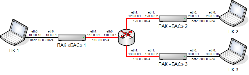 Данный сценарий описывает подключение к защищаемой при помощи ПАК «БАС» 1 – ПАК «БАС» 2 подсети (ПК 1) другой защищаемой при помощи ПАК «БАС» 3 подсети (ПК 2). ПАК «БАС» 1 – ПАК «БАС» 2 объединены в кластер для создания отказоустойчивого решения при помощи протокола VRRP.
