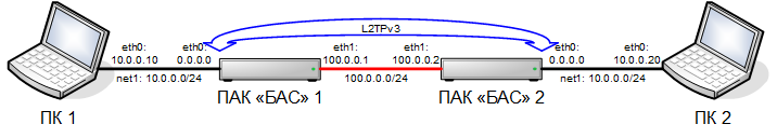 Данный сценарий описывает возможность объединения двух сегментов одной сети при помощи ПАК «БАС». Объединение происходит на канальном уровне (L2).